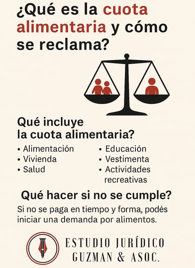 La cuota alimentaria es un derecho de los niños y una obligación de los padres. En esta publicación del Estudio Jurídico Guzmán & Asoc., abogados Buenos Aires con sede en Quilmes, te explicamos qué incluye, cómo se fija y qué hacer si no se cumple. Si necesitás reclamar alimentos o asesorarte sobre tu situación legal, te ayudamos con compromiso y experiencia.